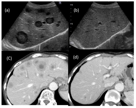 Changes in the US and CT findings: multiple tumors that had been suggested to be metastatic tumors (a,b) were barely detected after two months of observation; (a,b) US findings; (c,d) CT findings.