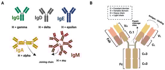 By producing immunoglobulins against foreign antigens, B cells play a critical role in the adaptive immune response. Immunoglobins, also known as antibodies, are a type of glycosylated protein molecule that appears on the surface of B cells and is secreted into the body fluid to perform a neutralizing function by binding to specific antigens. Immunoglobulins are classified into five subtypes: IgM, IgD, IgG, IgA, and IgE, respectively (Figure 1A). These subtypes are classified based on the structure of the immunoglobulin (Figure 1B). The immunoglobulin is made up of four proteins that are linked together by disulfide bonds. Based on molecule weight, these four proteins are referred to as "heavy chain" and "light chain". The antigen-binding side is also formed by the combined efforts of the heavy and light chains at the N-terminus. Furthermore, the classification is based on the C-terminus regions of the heavy chains. Although the C-terminus is not involved in antigen binding, the effector functions are essential [1].