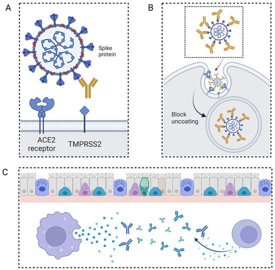 As part of an immune response, neutralizing antibodies bind to specific corresponding antigens. Furthermore, unlike other antibodies, they react with viruses or other pathogens, as well as some cytokines. The neutralizing antibodies, on the other hand, are ineffective against extracellular bacteria because antibody binding does not prevent bacteria from multiplying (Figure 2). Finally, they can disable pathogens or somatic cell functions, thereby preventing human infections and illnesses [7]. Infection prevention is achieved by the following means: (1) Avoiding the combination of pathogens and somatic cell surface receptors, e.g., monoclonal blocking antibody neuropilin-1, which is known for its ability to bind furin-cleaved substrate. Blocking these receptors or entry cofactors may reduce the pathogens’ infectivity [8]. (2) Preventing virus uncoating in somatic cells. Uncoating or capsid core disassembly is essential before the viral genomic DNA integrates into the host chromosomes. The structure of some viral coats was previously revealed [9]—even the cellular location of uncoating was identified for some viruses as well [10]. Zhang et al. proposed an essential method for treating enterovirus 71 infection by preventing the uncoating process and stopping the hole formation on the membrane [11]. (3) By influencing the cytokines in the serum. Since the cytokines play a fundamental role in the immune response regulation, the abnormal phenotype may be adjusted into the normal range through cytokine mimicry or neutralization.