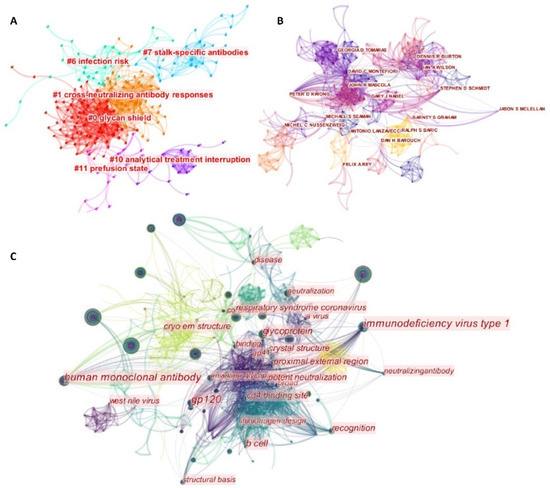 Clustering analysis of Web of Science abstracts (2010–present) on the subject of neutralizing antibodies. (A) The auto-clusters are labeled with an abstract index. (B) The auto clusters are labeled with the author index. (C) Clustering of keywords among neutralizing antibody-related papers.