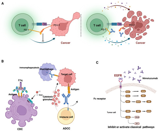 Some clinically used mAbs work by modulating the immune system. Antibodies that target PD-1/PD-L1 and CTLA-4 have already shown significant efficacy in treating patients with a variety of cancers (Figure 4A). The immune checkpoint plays a preventative role in immune response, which initially aids in the survival of healthy cells in the body. Immune checkpoint proteins link the targeted cell to the immune cell and send the terminal signal to the immune cell. These mAbs that target immune checkpoints can prevent the transmission of these terminal signals. Downregulation of the immune system is beneficial in the treatment of autoimmune disease, whereas upregulation is beneficial in the treatment of cancer patients.