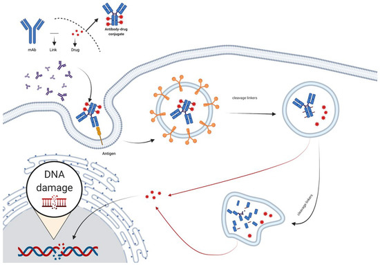 Pattern diagram of antibody–drug conjugates (ADC). Chemical linkers with labile bonds attach monoclonal antibodies to biologically active drugs. Internalized vesicles go through the endosome—lysosome pathway. Proteases digest the monoclonal antibody to release drugs (created with Biorender).