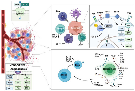 Cancer and autoimmune disease can be compared to two sides of the same coin, with the former being caused in part by immune system downregulation and the latter being caused by immune reaction hyperactivation. Pathology classifies lung cancer into two subtypes: non-small cell lung cancer (lung squamous cell carcinoma, lung adenocarcinoma, and large cell carcinoma) and small cell lung cancer. Lung tumors exhibit nearly all of the hall markers described by D. Hanahan [64]. In general, growth signals (the majority of which play a significant role in embryo development) are abundantly expressed and provide a crushing momentum for antigrowth signaling. Meanwhile, angiogenesis and cancer metastasis-related signals are expressed in cancer tissue. In particular, epidermal growth factor receptor (EGFR) activation is common in non-small cell lung cancer, whereas the KIT receptor is the main player in small cell lung cancer [65]. Furthermore, because SCLCs have both autocrine and paracrine abilities, they can activate G-protein-coupled receptors with gastrin-releasing bombesin-like peptides. These activation cascades will have an impact on multiple subcellular signaling pathways [66]. Mutations are another feature of lung cancer, and some researchers believe they are far more important than abnormal gene expression [67]. The well-known TP53 gene mutation was found in 90% of SCLCs and 50% of NSCLCs, and MYC amplification was frequently found in SCLCs.
