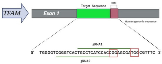 Two gRNAs complementary to TFAM exon 1 were designed using the CRISPOR (www.crispor.org, accessed on 10 October 2021) online tool (Figure 1), gRNA1: TGCCTCATCCACCGGAGCGATGG; gRNA2: CGGGTCACTGCCTCATCCACCGG.