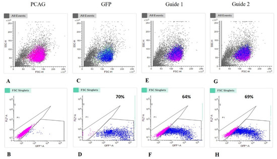 GFP positive immunophenotyping by flow cytometry. In (A,B) negative control (pCAG) showing sample viability; (C,D) 70% positive expression of GFP; (E,F) 64% positive expression of gRNA 1; (G,H) 69.42% positive expression of gRNA 2.