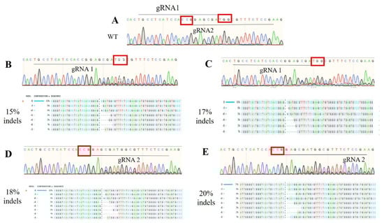 Genomic DNA was extracted from cells using a Qiamp DNA micro kit (Qiagen, Hilden, Germany), according to the manufacturer’s protocol. The genomic region (gRNA target site) was PCR amplified using primers shown in Table 1. PCR products were Sanger sequenced and with these results, it was possible to determine the percentage of indels in the cellular pools by Synthego (https://ice.synthego.com/#/ (accessed on 10 October 2019)) online software tools to evaluate InDels in each region compared to control cells [19].