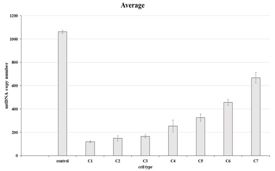 Alterations in mtDNA, such as a decrease in quantity, can cause impaired energy production leading to several clinical disorders. Furthermore, the result of this dysfunction can cause damage to mtDNA compromising mitochondrial function [6,7]. The mtDNA disorders are implicated in many severe diseases caused by molecular defects in oxidative phosphorylation, cell apoptosis, and the lack of a proper bioenergetic supply to mitochondria [8].