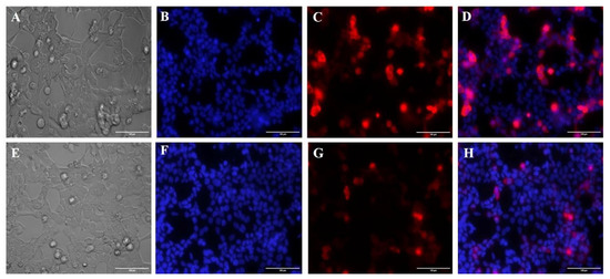 Photomicrograph of epifluorescence with Mitotracker Red marker. Analysis of the mitochondrial membrane potential of edited versus non-edited cells. In (A,E) control, (B–F) DAPI marker, (C–G) Mitotracker Red fluorescence, and (D–H) merged.
