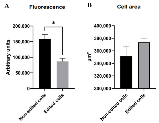 Comparison of Mitotracker Red expression and cell surface area between edited and non-edited cells. (A) Red fluorescence intensity in edited and non-edited cells, p ≤ 0.05. (B) Cell surface area in edited and non-edited cells, p ≥ 0.04. * Difference in fluorescence between edited and non-edited cells.