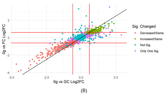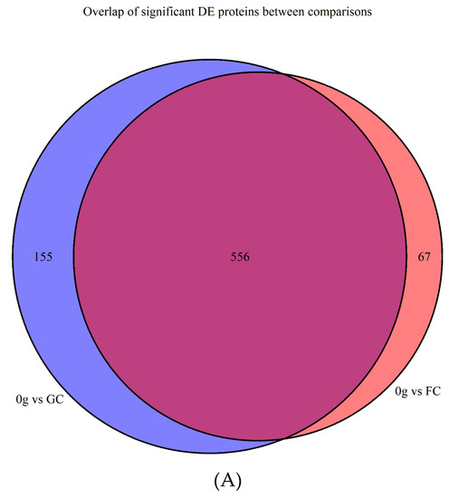 Comparison of the ‘’0 g vs. GC’’ and ‘’0 g vs. FC’’ contrasts of D. radiodurans proteins based on proteomics data obtained during parabolic flight. (A) Venn diagram of significantly changed proteins in the two contrasts. (B) Scatter plot of ‘’0 g vs. FC’’ vs. ‘’0 g vs. GC’’ Log2 fold changes of all 1200 proteins. Decreased/Same—protein was decreased in abundance in 0 g in both contrasts; Not Sig.—protein showed no significant changes in both contrasts; Only One Sig.— protein was significant in one of the two contrasts; Increased/Same—protein was increased in abundance in 0 g in both contrasts.