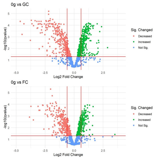 A total of 1925 proteins were identified in at least one replicate, which represents 61.7% of the D. radiodurans genome. Three treatment groups of four replicates were present. These treatment groups represented the gravity state in which the cells were placed: 0 g (microgravity), flight control (FC; increased gravity), and ground control (GC; control). Data was filtered to a maximum of 1 missing value in the treatment group (at least 3/4 numerical values in each 0 g, FC, and GC), which decreased the number of proteins for analysis from 1925 to 1200. PCA plots, created with the DEP PCA tool, showed that sample GC_4 was an important driver for PC2, which represented the within-group separation and decreased between-group separation in PC1 (Figure S3). Based on these QC results, sample GC_4 was removed from further analysis. QC plots obtained with the built-in DEP tools showed no additional issues. After removal, imputation of remaining missing values was performed with QRILC with 10.4% (125/1200) of values being imputed. PCA of the 1200 proteins showed clear separation between the microgravity and other groups in PC1, explaining 46.9% of variation (Figure S3). Statistical analysis with the DEP pipeline showed 711 (q-value < 0.05) differentially abundant proteins between cells subjected to microgravity (0 g) and ground control (GC). A total of 357 proteins were more abundant and 354 were less abundant when subjected to microgravity during parabolic flight. Between the FC and GC samples, no significant differences were obtained. The comparison between 0 g and FC shows 623 differentially abundant proteins, with most proteins being differentially abundant as in the 0 g/GC comparison. Only 67 proteins were unique (not found in the 0 g vs. GC contrast) and are shown in Table 1. Figure 1 shows that there is large overlap in significant changes between the two contrasts, and that proteins with significant decreases in abundance also have on average larger Log2 FC values. Volcano plots in Figure 2, representing the two contrasts, show the differential abundances of the two contrasts graphically. All Log2 expression values, Log2 fold changes between treatments, and statistical analysis results can be found in Table S1.
