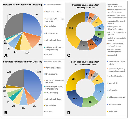 Differentially abundant proteins (0 g/GC) were grouped based on their GO biological process and molecular function tags obtained automatically with DAVID and manual assignment from UniProt. Proteins with increased and decreased abundance were grouped separately. In the increased abundance grouping, 275 proteins were placed in 8 groups while 82 proteins could not be clustered due to lack of functional information. A total of 244 proteins with significantly decreased abundance were clustered in seven groups; 109 proteins could not be grouped due to lack of information. The groups/clusters and the number of proteins in each group are shown in Figure 3, and all groups/clusters, as well as Log2 fold changes of proteins with significantly decreased abundance, are shown in Table S2. Gene ontology enrichment analysis of biological processes (BP) and molecular function (MF) were performed with the online gene ontology enrichment tool. Enriched ontology terms for proteins with increased abundance in the 0 g vs. GC contrast are shown in Figure 3. BP terms show enrichment in carbohydrate, ribonucleotide, and monocarboxylic acid metabolism, as well as amino acid, nucleotide, and ribose phosphate biosynthesis. Additionally, tRNA aminoacylation and peptidoglycan biosynthesis show significant enrichment. MF terms show enrichment in lyase, ligase, aminoacyl-tRNA ligase, and oxidoreductase activity, as well as metal ion, ATP, and nucleoside binding. For proteins with decreased abundance in this contrast, ‘translation’ (BP) and ‘structural constituent of ribosome’ (MF) and ‘rRNA binding’ (MF) were the only enriched terms. Overall, the enriched terms reflect the manual grouping of the proteins well.