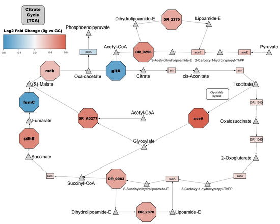 Further investigation within the general metabolism group showed proteins belonging to numerous KEGG pathways involved in energy metabolism. The citric acid cycle pathway (KEGG dra00020) contains multiple proteins with significantly increased abundance (Figure 4). Most other proteinaceous members of the pathway appear to be more abundant but do not meet the significance threshold. In the pentose phosphate pathway (KEGG dra00030), five proteins show significantly increased abundance (Table 2).