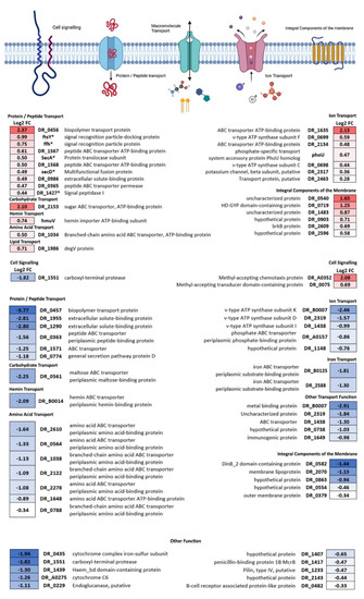 The second largest group of both proteins with increased and decreased abundance are membrane proteins. As shown in Figure 5, transport proteins represent the largest part of the increased abundance proteins in this cluster (21 out of 30 proteins), and their functions involve protein/peptide (10 proteins), ion (7 proteins), amino acid (1 protein), carbohydrate (1 protein), lipid (1 protein), and hemin transport (1 protein). Additionally, two significant proteins show involvement in cell signalling, whereas the remaining six proteins in this group are associated with the integrity of the membrane. Proteins with significantly increased abundance are enriched in three KEGG pathways: protein export (5/15 proteins, dra03060; represented with * in Figure 5), bacterial secretion system (4/11 proteins, dra03070, showing overlap with dra03060), and quorum sensing (9/58 proteins, dra02024). A total of 43 decreased abundance proteins are represented in the membrane proteins group. Transport proteins also constitute the largest proportion (28 out of 43 proteins), showing a decrease in protein/peptide (6 proteins), carbohydrate (1 protein), hemin (1 protein), ion (5 proteins), and iron (2 proteins) transporters. Notably, seven amino acid transporters show a significant decrease in abundance compared to GC, whereas only one amino acid transporter is significantly increased in abundance. The exact function of the five transport proteins (Figure 5, “Other Transport function”) is unknown. Moreover, five membrane integrity proteins were decreased in abundance in this group, whereas the exact function of 10 proteins in this group (Figure 5, “Other function”) could not be specified. Proteins with significantly decreased abundance are enriched in three KEGG pathways: ABC transporters (10/79 proteins, dra02010), oxidative phosphorylation (3/33 proteins, dra00190), and quorum sensing (5/58 proteins, dra02024). It has to be noted that the quorum sensing pathway does not correspond uniquely to D. radiodurans functions but is present in multiple species and D. radiodurans has proteins for some of the depicted reactions [45].