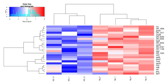 Heatmap of the D. radiodurans proteins with significantly increased protein abundance in the translation, ribosomes, and rRNA cluster. Rows are z-score normalized. Clustering based on complete linkage and Euclidean distance.