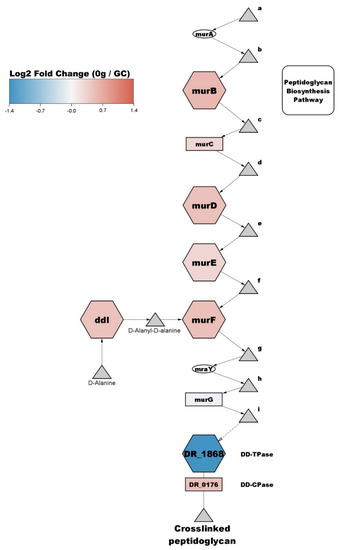 Out of 14 proteins with significantly increased abundance in the cell cycle and cell shape cluster, three are increased in abundance by more than twofold, DR_1488 (membrane-bound protein LytR), DR_0770 (fimbrial assembly protein PilM), and DR_1397 (hypothetical protein). The protein with the most decreased abundance in this cluster is DR_2394 (N-acetylmuramoyl-L-alanine amidase), which shows a decrease of 12.5-fold. Protein DR_0938 (hypothetical protein) is also strongly decreased in abundance, decreasing five-fold compared to GC. Three other proteins show a decrease of more than twofold, DR_1062 (FemA-like protein), DR_1868 (penicillin-binding protein 2), and DR_0853 (gliding motility protein). Additionally, 5/14 increased abundance (ddI, murB, murD, murE, DR_0768) and 1/9 (DR_1868) decreased abundance proteins are a part of the Peptidoglycan biosynthesis pathway (KEGG dra00550), seen in Figure 7. Proteins from this cluster are present in other cell-wall related pathways, such as vancomycin resistance (KEGG dra01502) and cationic antimicrobial peptide (CAMP) resistance (KEGG dra01503).
