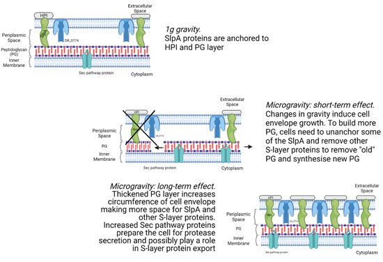 Based on the results presented here and published earlier by Ott et al. [26], it is possible to develop a hypothesis as to how D. radiodurans regulates its cell envelope remodeling under microgravity conditions. Previous studies have shown that many bacterial species become more resistant to extracellular stressors by increasing cell aggregation and biofilm production when subjected to real or simulated microgravity [84,85,86]. D. radiodurans is not known to form biofilms in its natural environment, although mutant strains have shown this ability [87]. Nevertheless, it is possible that D. radiodurans also possesses similar mechanisms in response to stress by modulating the thickness of the protective cell envelope. While results after 48 h of microgravity show an increase in S-layer proteins, the immediate response to microgravity presented here shows a decrease in the same proteins. This can possibly be explained by remodeling of cell envelopes and addition of newly synthesized S-layer proteins after long term exposure to microgravity. Bacterial peptidoglycan synthesis has been shown to require removal of “old” glycan chains to synthesize new chains [88]. This could support the hypothesis that expansion of the peptidoglycan layer and subsequently the other cell envelope components cannot occur before some of the anchored S-layer proteins are removed together with the “old” peptidoglycan. After increasing the surface area and/or thickness of the peptidoglycan layer, the S-layer proteins are freshly secreted in larger numbers to match the increased volume/area and would also align well with the results from the simulated microgravity study (hypothesis visualized in Figure 8). This hypothesis could be tested by performing a similar parabolic flight experiment but with more parabolas and timepoints, thus generating a timeline of protein changes. If S-layer proteins do follow a decrease-then-increase pattern, it could provide evidence in favor of this hypothesis.