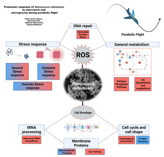 Multiple functional categories of differentially abundant proteins of D. radiodurans during parabolic flight. Red color indicates significant increase in protein abundance in microgravity in the respective functional cluster. Blue color indicates significant decrease in protein abundance in microgravity in the respective functional cluster.