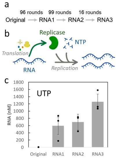 First, we compared the replication abilities of these RNAs. Each RNA (10 nM) was incubated in the reconstituted translation system of E. coli at 37 °C for 2.5 h. In this reaction, the RNAPs were translated from the RNA and they in turn replicated the RNA (Figure 1b). RNA concentration was then measured by quantitative PCR after reverse transcription (RT-qPCR) (Figure 1c). The concentration of the original RNA was found to be close to 10 nM, indicating that the original RNA barely replicated, while RNA1 was significantly amplified, which was consistent with a previous report [17]. The replication of RNA2 and 3 further increased as the number of rounds increased.