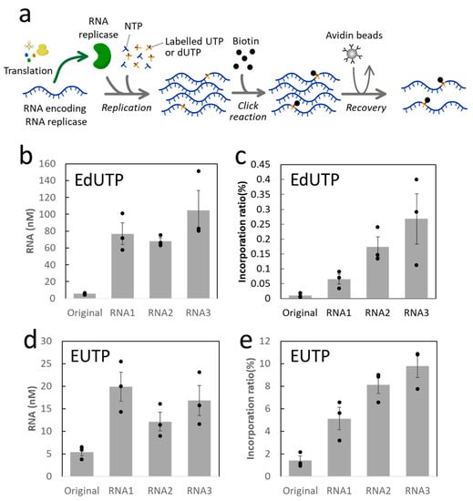 RNA replication and the incorporation ratios in the presence of EdUTP and EUTP. (a) Experimental procedure for the detection of EdUTP or EUTP incorporation. First, each RNA (10 nM) is replicated by the RNA polymerase translated from itself in the presence of EdUTP or EUTP. Second, the ethynyl-labeled RNA is conjugated with biotin by click reaction. Third, the biotinylated RNA is recovered using avidin-coated magnetic beads. The RNA concentrations before and after the recovery step are measured by RT-qPCR. (b) RNA concentrations before the recovery with 1.1 mM EdUTP and 0.11 mM UTP. (c) EdUTP incorporation ratios in the replicated RNAs, i.e., the ratios of the RNA concentrations after the recovery to those before the recovery, of the RNAs replicated in b. (d) RNA concentrations before the recovery with 1.1 mM EUTP and 0.11 mM UTP. (e) EUTP incorporation ratios, i.e., the ratios of the RNA concentrations after the recovery to those before the recovery, of the RNAs replicated in d. The error bars represent standard error (n = 3).