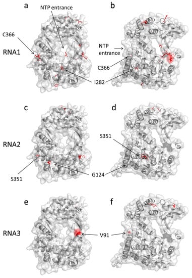 Location of the fixed mutations in each RNA polymerase. Front (a,c,e) and left side (b,d,f) views of the β subunit of Qβ replicase showing the location of the newly fixed mutations in (a,b) RNA1, (c,d) RNA2, and (e,f) RNA3 in red. The 3D structure is taken from Protein Data Bank 3AGP.