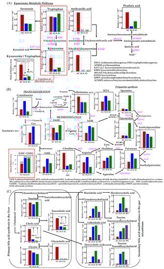 In the kynurenine pathway (Figure 7A), all major metabolites metabolized from tryptophan were strongly upregulated in AC mice. In human patients with AD and those with mild cognitive impairment, the kynurenine/tryptophan ratio, which has been reported to be about twice of that found in healthy subjects [61,62], was approximately 22% for AC, 3.6% for ALA, and 5.2% for AL. In our studies, suppression of the kynurenine/tryptophan ratio was achieved up to 99.8% and 99.7% in ALA and AL mice, respectively. In addition, 3-hydroxykynurenine, which is listed as a toxic metabolite that may exhibit neurotoxicity and induce oxidative damage and cell death in brain neurons [63], and anthranilic acid, for which elevated plasma levels and a risk associated with dementia have been reported [64], were identified only in the AC mice.