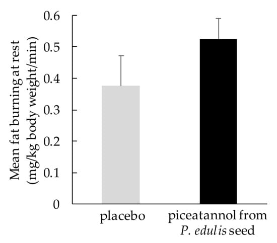 Human studies on fat metabolism have been conducted, and a double-blind, placebo-controlled, crossover study showed that a food containing 10 mg piceatannol from P. edulis seeds for 1 week significantly reduced the respiratory quotient at rest and during very light exercise []. Moreover, the mean amount of fat burning at rest was increased by 39.5% during piceatannol intake compared to placebo intake (Figure 1). Another study showed that even during moderate-intensity exercise, intake of 10 mg of piceatannol from P. edulis seeds for 2 weeks significantly increased fat burning and decreased the respiratory quotient compared to the placebo []. These results show that P. edulis seed extract containing piceatannol can promote fat burning both at rest and during exercise.