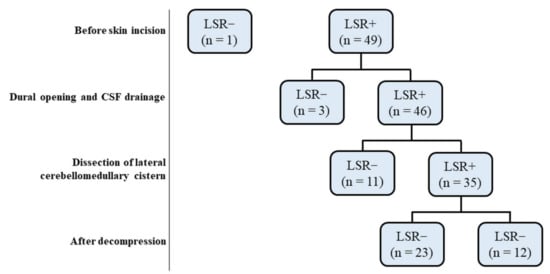 Following the IOM of 50 patients (Figure 1), one was excluded from the study owing to the lack of LSR induction throughout the procedure. The other 49 patients were divided into two groups i.e., A (n = 14) and B (n = 35), designated as with or without early LSR loss groups, respectively before decompression (Table 1). We found the mean age of group A significantly much younger than group B (p = 0.0393). The early LSR loss rate before decompression was 28.6%. In group A patients, LSR disappeared while CSF egressed after dural opening (n = 3) as well as during the dissection of the lateral cerebellomedullary cistern (n = 11) (Figure 2).