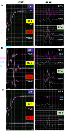 General anesthesia was performed on all the patients using propofol combined with sevoflurane (approximately 0.5 minimum alveolar concentration). Thereafter, the IOM using the combined traditional LSR (tLSR) and dual LSR (dLSR) was conducted throughout each surgical procedure. A commercial intraoperative neurophysiological monitoring system (Cadwell Cascade Elite, Kennewick, WA, USA) was used to amplify, filter, and display signals.