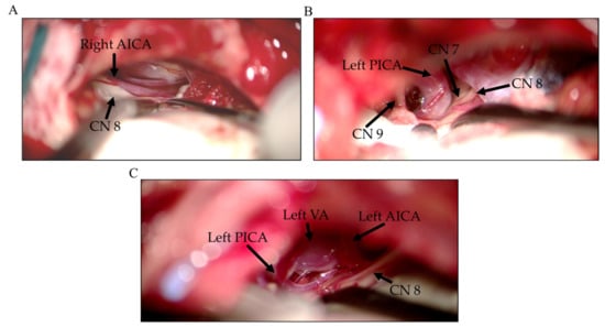 Notably, except for the two patients with tinnitus, all patients were fully recovered from their complications. No cerebellar hemorrhage, infarction, CSF leakage, infection, or mortality occurred in either group. Taken together, our results showed a younger mean age of group A compared to group B. The components of the offending vessels differed significantly with AICA as a predominant offending vessel in group A. However, considerably more VA-involved and PICA were identified as offending vessels in group B. The postoperative clinical outcomes also differed between the groups with the favorable outcomes in predominantly in group A.