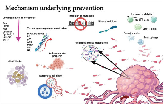 Schematic representation of mechanisms underlying the prevention or treatment of cancer using probiotics. The strategies include apoptosis, antimutagenic activity, down regulation of oncogene expression, autophagy induction in tumor cells, kinase inhibition, immune modulation, tumour gene suppressor reactivation, and antimetastatic property. Created with BioRender.com, accessed on 28 December 2021.