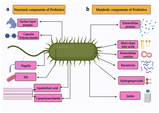 Schematic representation of the metabiotics of probiotics. The metabiotics of probiotics can be divided in two types: (a) Structural components include surface proteins, capsular polysaccharide, flagella, pili, lipoteichoic acid, and lipopolysaccharide. (b) Metabolic components include extracellular proteins, short-chain fatty acids, extracellular vesicles, bacteriocin, and indole. Created with BioRender.com, accessed on 28 December 2021.