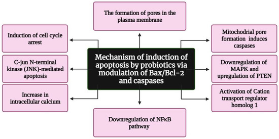 Flowchart representing the mechanism of apoptosis induction by probiotics via the modulation of Bax/Bcl-2 and caspases. Bax: Bcl-2-associated X protein; Bcl-2: B cell lymphoma 2; MAPK: mitogen-activated protein kinase; PTEN: Phosphatase and TENsin homolog deleted on chromosome 10; and NFkB: nuclear factor kappa-light-chain-enhancer of activated B cells. Created with BioRender.com, accessed on 28 December 2021.