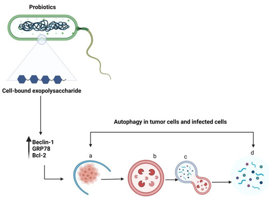 Schematic representation of autophagy in tumour cells or infected cells. The cell-bound exopolysaccharide of probiotic bacteria induces autophagy by upregulating Beclin-1, GRP78, and Bcl-2 genes. The sequential events occurring during autophagy include (a) sequestration (b) transport to lysosomes, (c) degradation, and (d) utilization of degradation products. Created with BioRender.com, accessed on 28 December 2021.