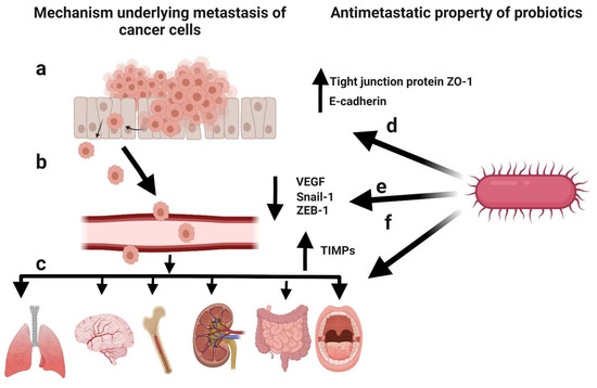 Schematic representation of the mechanism underlying cancer metastasis and the antimetastatic potential of probiotics. (a) Infiltration of cancer cells through the basement membrane. (b) Intravasation into the surrounding vasculature or lymphatic system. (c) Extravasation to secondary tissue and colonization as secondary tumours. (d) Elevated levels of the tight junction protein ZO-1 and E-cadherin induced by probiotics to inhibit metastasis. (e) Decreased levels of epithelial–mesenchymal transition (EMT)-related markers (Snail-1 and ZEB-1) and vascular endothelial growth factor (VEGF) induced by probiotics to inhibit metastasis. (f) Upregulation of tissue inhibitors of matrix metalloproteinases (TIMPs) by probiotics to inhibit metastasis. Created with BioRender.com, accessed on 28 December 2021.