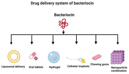 Despite having excellent antimicrobial, antioxidant, and anticancer activities, bacteriocins may not be optimal for use as a drug delivery system. They can be easily digested by proteolytic enzymes in the intestinal tract. Hence, there is a need to examine alternative systems, such as liposomal delivery, for the delivery of antimicrobial and anticancer peptides (Figure 7) [155,156]. Nanotechnology is a valuable strategy to improve bacteriocin formulations and incorporate them into nanoparticles for delivery [157,158]. Nisin, a bacteriocin, has been successfully used in implants and delivered in vivo to prevent the growth of Staphylococcus aureus [159]. Hydrogels can be loaded with bacteriocins prior to delivery [155,160]. Bacteriocins can also be administered in the form of oral tablets [161] and chewing gum [162]. Additionally, bacteriocins can be used to coat medical devices, such as catheters, to prevent infections by inhibiting the adhesion of bacteria to their surfaces [163].