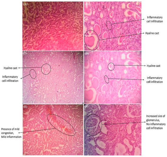 The observations from the histopathology analysis of the kidney tissues were consistent with the results of the biochemical parameters. In Figure 2A, the NC group’s kidney tissues showed normal glomerular structure and interstitium and no inflammatory cell infiltration. The kidney tissues of the GEN group exhibited extensive necrosis, glomerular congestion, interstitial congestion, and inflammatory cell infiltration (Figure 2B). The kidney tissues, glomerular and interstitial infiltration of inflammatory cells of GEN + WS group were focally present along with mildly congested blood vessels in the interstitium, mild hyelin cast in the tubule (Figure 2C). The kidney tissues of the Red Grape (GEN + RG) group revealed mild desquamation of proximal tubules. Focal glomerular and interstitial infiltrations of inflammatory cells along with mildly congested blood vessels in the interstitial mild hyelin cast in the tubule were found (Figure 2D). The probiotic 4B (GEN + P4) Group showed no glomerular and interstitial infiltration of inflammatory cells along with mildly congested blood vessels in the interstitium (focally present) (Figure 2E). The probiotic 8B (GEN + P8) group (Figure 2F) exhibited necrosis of proximal tubules. It also revealed no glomerular and interstitial infiltration of inflammatory cells along with some congested blood vessels in the interstitium and severe hyelin cast in the tissue. It also showed an increased number of glomerulus with increased size.