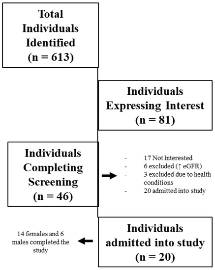 A total of 613 individuals were identified as potential research participants (see Figure 1). In total, 46 individuals met entry criteria based on the inclusion/exclusion characteristics and agreed to participate in the study. Each of the 46 participants completed the initial, preliminary, and physiologic screening sessions. However, during the physiological screening session, 26 were excluded due to higher than desired eGFR (n = 18), musculoskeletal concerns (n = 7), and positive stress tests (n = 1). The remaining 20 participants met all the inclusion criteria, passed the physiological screening session, were admitted into the study, and completed the study.