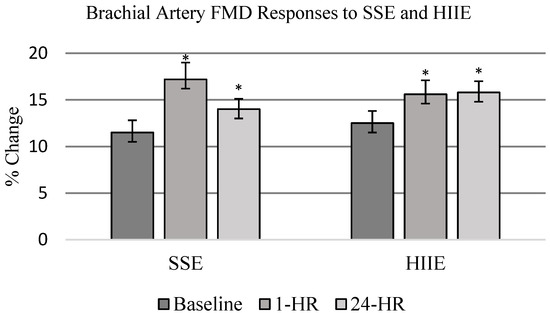 FMD responses to SSE and HIIE. FMD measurements were performed at baseline, 1 h post-exercise (PE), and 24 h PE. Data are presented as mean ± SE and represent percent change in vessel diameter. Exercise significantly increased vessel diameter as measured by FMD when compared to baseline. SSE (pre-exercise = 11.5 ± 1.3; 1 h = 17.2 * ± 1.8; 24 h = 14.0 * ± 1.1%) HIIE (pre-exercise = 12.5 ± 1.3; 1 h = 15.6 * ± 1.5; 24 h = 15.8 * ± 1.2%) with no statistically significant difference between exercise conditions (* p < 0.05 compared to baseline measure).
