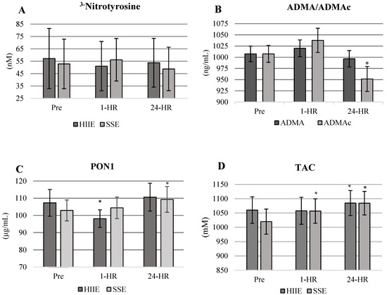 (A–D) Values are presented as means ± standard error. * = significantly different from Pre- to 1-HR and 24-HR post-exercise. (A) No significant differences in 3−NT were observed between conditions or time points. (B) ADMAc is significantly decreased in both conditions at 24-HR. Means are combined across conditions. ADMAc = Asymmetric dimethylarginine corrected for shifts in plasma volume. (C) PON1 response by condition and time. PON1 significantly increases at 24 h in SSE with no significant increases in HIIE. (D) TAC response by condition.