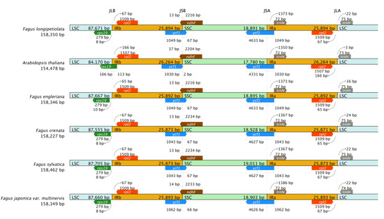 Comparisons of IR-SC boundary locations across the cp genomes of the five Fagus and A. thaliana.