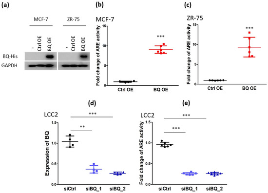 The following supporting information can be downloaded at https://www.mdpi.com/article/10.3390/life12010093/s1, Figure S1. Endogenous BQ expression level and basal ARE activity in MCF-7 and LCC2, Figure S2. The effect of BQ knockdown in LCC2, Figure S3. Relative mRNA expression of genes contained both ARE and ERE in their promoter region, Figure S4. Expression of IL-8 in MCF-7 and LCC2 and the effect of BQ overexpression in MCF-7 and ZR-75, Figure S5. Protein quantification of Western blot in this study, Figure S6. Original blots of Western blot of this study. Table S1: List of qPCR primer sequences used in this study, Table S2: Clinical characteristics of breast cancer patients.