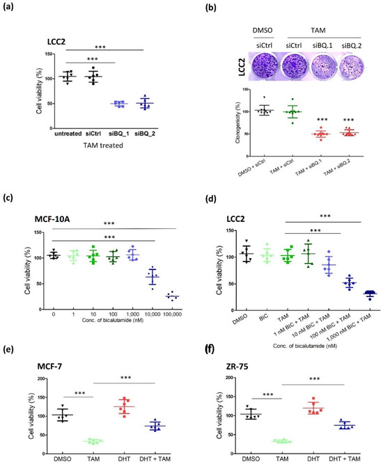 Next, we assessed whether AR activity could modulate tamoxifen resistance by comparing the response to tamoxifen in control LCC2 and LCC2 with BQ down-regulation. First, we confirmed that knockdown of BQ within 96 h did not affect cell viability (Figure S2). Next, we performed an MTT assay to determine if knockdown of BQ would affect tamoxifen response. The results from MTT suggested that knockdown of BQ could make LCC sensitive to tamoxifen (Figure 2a). A Clonogenic assay revealed similar results (Figure 2b). To further consolidate our findings, we employed AR antagonist bicalutamide (BIC). We found that 1 µM of BIC was the maximal non-lethal dosage of bicalutamide in a normal breast cell line MCF-10A as revealed by the MTT assay (Figure 2c). Next, we confirmed that neither 1 µM of bicalutamide nor 4 µM of tamoxifen affected the cell viability of LCC2 (Figure 2d). However, co-treatment of different concentrations of bicalutamide and 4 µM of tamoxifen could recover response to tamoxifen in LCC2 in a dose-dependent manner (Figure 2d). As further confirmation, we treated MCF-7 and ZR-75 with 0.1 nM of DHT to activate AR signaling and determine the response to tamoxifen in these activated cells. The results from MTT showed that activation of AR made MCF-7 (Figure 2e) and ZR-75 (Figure 2f) tolerant to tamoxifen, suggesting that activation of AR signaling can confer tamoxifen resistance in breast cancer.