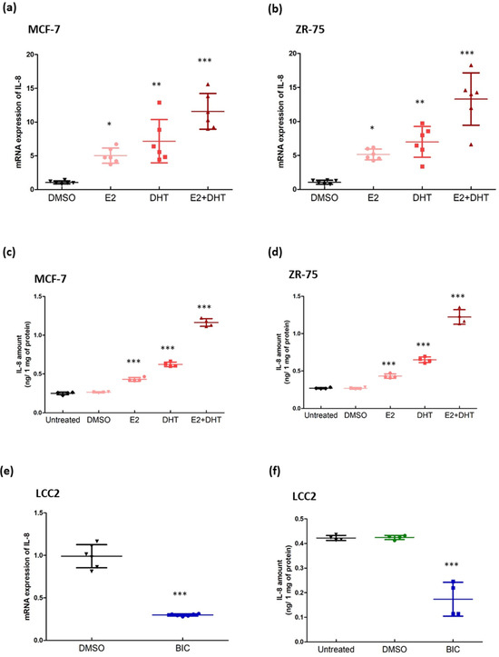 Modulating the activity of AR could interfere with the expression of IL-8. The effect of estrogen and androgen on the expression of IL-8 in (a) MCF-7 and (b) ZR-75. The cells were treated with 1 nM of Estradiol (E2; estrogen) and/or 0.1 nM of dihydrotestosterone (DHT; androgen) for 24 h. qPCR was performed. Actin was used as the internal control. Results were shown as mean ± SD from 6 independent experiments. One-way ANOVA was employed. Bonferroni’s multiple comparison test was employed to determine the significance between DMSO and any of the treatment groups. (c,d) ELISA was performed to confirm the effect of 1 nM of E2 and 0.1 nM of DHT on the production of IL-8. Culture medium was collected after 24 h of the treatment. ELISA was performed to determine the amount of IL-8 in the medium. Results were shown as mean ± SD from 4 independent experiments. One-way ANOVA was employed. Bonferroni’s multiple comparison test was employed to determine the significance between untreated and any of the treatment groups. Suppression of AR could reduce the (e) mRNA expression and (f) protein production of IL-8 in LCC2. The cells were treated with 1 µM of bicalutamide (BIC; AR antagonist) for 48 h. qPCR was performed to determine mRNA. Results were shown as mean ± SD from 4 independent experiments. Student’s t-test was employed to determine statistical significance. ELISA was performed to evaluate the production of IL-8 in the culture medium. Results were shown as mean ± SD from 4 independent experiments. One-way ANOVA was employed. Bonferroni’s multiple comparison test was employed to determine the significance between untreated and BIC treated groups. *, **, and *** represent p < 0.05, p < 0.01 and p < 0.001.