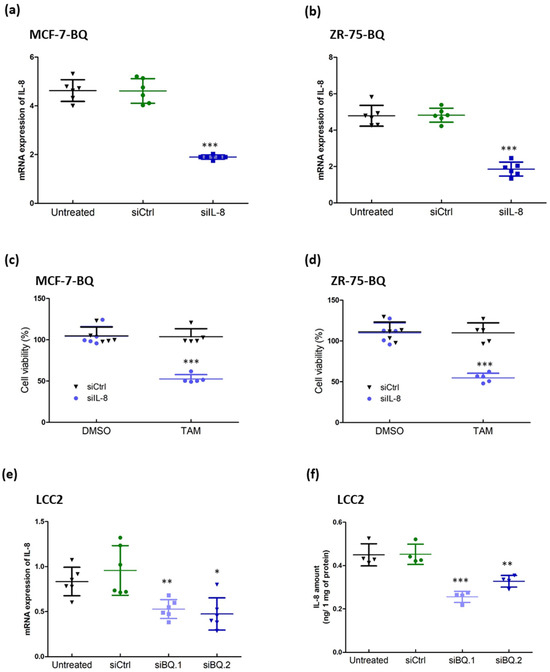 We next examined whether IL-8 could modulate tamoxifen response. First, we confirmed that the expression of IL-8 mRNA (Figure S4a) and the amount of IL-8 protein (Figure S4b) were higher in LCC2 when compared to MCF-7. Next, we found that overexpression of BQ in MCF-7 and ZR-75 could enhance the expression of IL-8 on both mRNA (Figure S4c,d) and protein levels (Figure S4e,f). The expression of IL-8 was directly correlated with the expression of BQ, suggesting that BQ regulates the expression of IL-8. We employed siRNA to reduce the expression of IL-8 in tamoxifen-resistant cell lines, MCF-7-BQ (Figure 4a) and ZR-75-BQ (Figure 4b). We found that down-regulation of IL-8 could reverse tamoxifen resistance in these cell lines (Figure 4c,d). When we knocked down BQ expression in LCC2, IL-8 expression was significantly reduced, as revealed by qPCR (Figure 4e) and ELISA (Figure 4f). As previously shown, BQ knockdown made LCC2 sensitive to tamoxifen (Figure 2A). These results suggest that IL-8 is one of the downstream pathways of BQ overexpression that modulates resistance to tamoxifen in breast cancer.