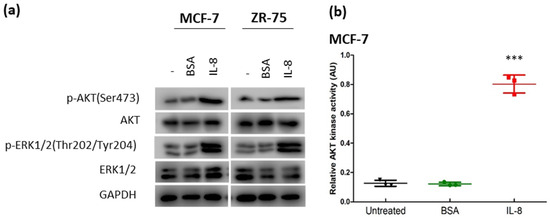 3.3. IL-8 Activated the AKT-ERK1/2 Axis to Modulate the Response to Tamoxifen