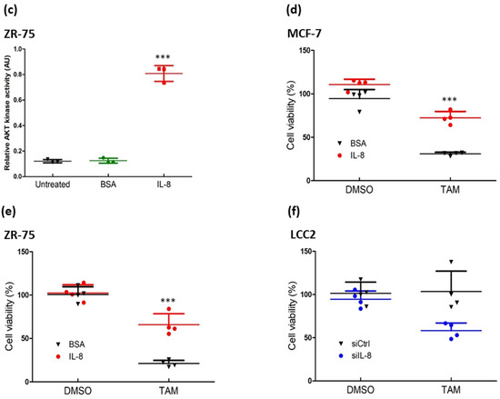 Treatment of IL-8 could induce tamoxifen resistance. (a) IL-8 could activate AKT and ERK1/2 in MCF-7 and ZR-75 cells. The cells were treated with 5 ng/mL of IL-8. Proteins were harvested 24 h post-treatment. Western blot was employed to determine the expression of the candidate proteins. GAPDH was the loading control. The treatment of IL-8 could enhance AKT kinase activity in (b) MCF-7 and (c) ZR-75. The cells were treated with 5 ng/mL of IL-8. AKT kinase activity assay was performed after 24 h of the treatment. Results were shown as mean ± SD from 3 independent experiments. One-way ANOVA was employed. Bonferroni’s multiple comparison test was employed to determine the significance between untreated and IL-8 treated groups. IL-8 treatment could enhance the tolerance to tamoxifen in (d) MCF-7 and (e) ZR-75. The cells were co-treated with 4 µM of 4-OHT (TAM) and 5 ng/mL of IL-8 or BSA for 96 h. MTT assay was employed to determine cell viability. Results were shown as mean ± SD from 4 independent experiments. Student’s t-test was employed to determine statistical significance between BSA, and IL-8 treated groups. (f) Knockdown of IL-8 could reduce tamoxifen resistance in LCC2. The cells were transfected with 25 µM of siCtrl or siIL-8. The cells were treated with 4 µM of TAM after 48 h of the transfection. MTT assay was performed after 96 h of TAM treatment. Results were shown as mean ± SD from 4 independent experiments. Student’s t-test was employed to determine statistical significance between siCtrl and siIL-8 treated groups. *** represents p < 0.001.