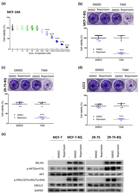 Treatment of CXCR1/2 inhibitor, repertaxin could reduce tamoxifen resistance. (a) The dosage-dependent effect of repertaxin on cell viability of MCF-10A. Non-cancerous breast epithelial cell line MCF-10A was used. The cells were treated with different concentrations of repertaxin for 96 h. MTT assay was performed. Results were shown as mean ± SD from 5 independent experiments. One-way ANOVA was employed. Bonferroni’s multiple comparison test was employed to determine the significance between 0 nM and other concentrations. Repertaxin could reduce tamoxifen resistance in (b) MCF-7-BQ, (c) ZR-75-BQ and (d) LCC2. The cells were co-treated with 4 µM of 4-OHT and 0.1 µM of repertaxin for 14 days. Clonogenic assay was performed. 0.01% crystal violet was used to stain the colonies. Results were shown as mean ± SD from 4 independent experiments. Student’s t-test was employed to determine statistical significance between DMSO and repertaxin treated groups. *** represents p < 0.001. (e) Repertaxin could suppress AKT and ERK1/2 activation on BQ overexpressing cells. MCF-7, MCF-7-BQ, ZR-75 and ZR-75-BQ cells were treated with 0.1 µM of repertaxin for 48 h. Western blot was used to determine the expression of the protein candidates. GAPDH was used as the loading control.