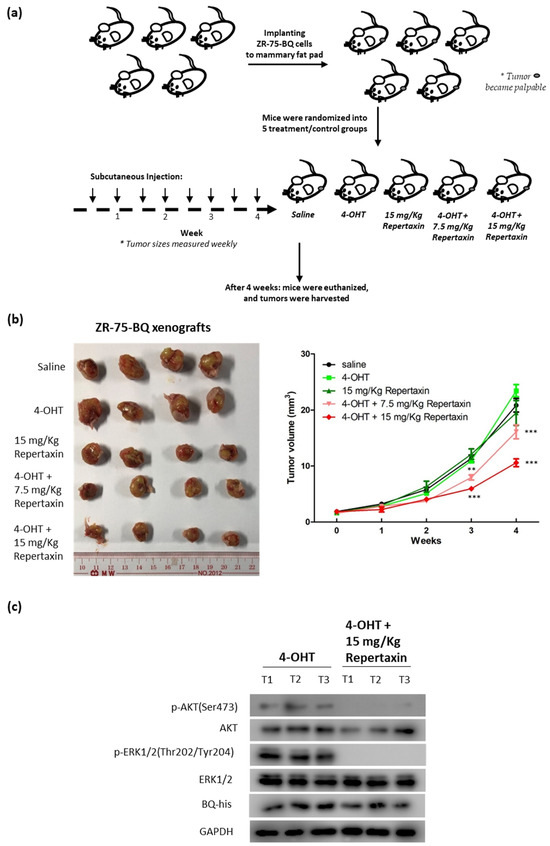 Female nude mice at the age of 5 to 6 weeks were used for this study. On the day of inoculation, the cell mixture containing 1 × 106 ZR-75-BQ cells was implanted into the mice’s abdominal mammary fat pad. The cell mixture was prepared by mixing 50 µL of the cell suspension containing 1 × 106 cell with 50 µL of Matrigel (356234; BD Bioscience, Franklin Lakes, NJ, USA), and the 100 µL of the cell mixture was injected into the mammary fat pad. When the tumors were palpable, mice were randomized into 5 groups: (1) Saline (n = 4); (2) 4-OHT (N = 4); (3) 15 mg/Kg repertaxin (n = 4); (4) 4-OHT + 15 mg/Kg repertaxin (n = 4) and; (5) 4-OHT + 15 mg/Kg repertaxin (n = 4). 0.5 mg of tamoxifen dissolved in peanut oil (Sigma-Aldrich, St. Louis, MO, USA) and/or repertaxin (7.5 mg/kg and 15 mg/Kg) by subcutaneous injection twice per week. The tumor sizes were measured regularly using a caliper, and the tumor volume was calculated as the longest diameter x (shortest diameter)2/2. At the endpoint of the experiments, mice were euthanized, and tumors were harvested. All the procedures were reviewed and approved by the HKU Committee on the Use of Live Animals in Teaching and Research (CULATR Number: 5140-19).