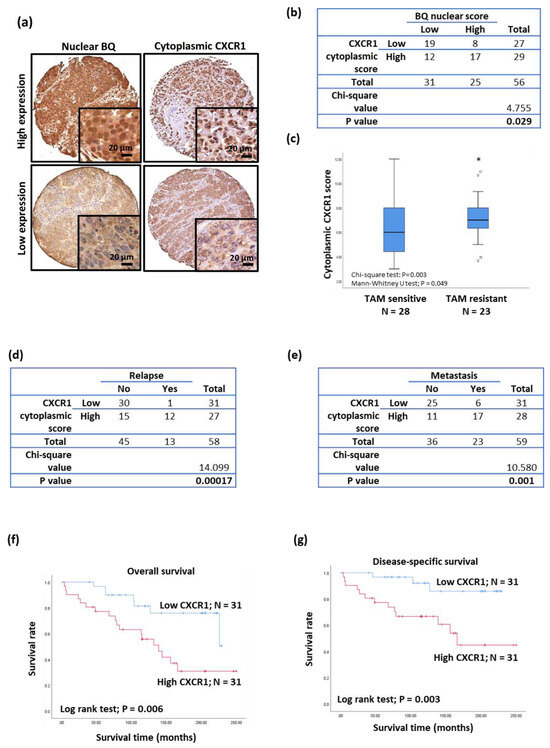 Immunohistochemistry was employed to assess the expression of CXCR1 and BQ in the primary ER+ve breast tumor (Figure 8a). Cytoplasmic CXCR1 expression was positively correlated with nuclear BQ expression (Figure 8b) shown by the chi-square test, p = 0.029. High cytoplasmic CXCR1 expression was also associated with tamoxifen resistance, relapse, and metastasis (Figure 8c–e). The Kaplan–Meir log-rank text showed it was significantly associated with poor outcome for overall survival (log-rank test; p = 0.006; Figure 8f) and disease-specific survival (log-rank test; p = 0.003; Figure 8g). Univariate Cox regression analysis for overall survival (Table 1) showed that cases with high cytoplasmic CXCR1 were significantly associated with poorer overall survival (RR = 3.171, 95% CI 1.322, 7.610; p = 0.010), but this failed to remain significant on multivariate analysis. Similar findings were obtained for combined analysis of high cytoplasmic CXCR1 and high nuclear BQ expression. Interestingly, a Cox regression analysis for disease-specific survival (Table 2) showed cases with high cytoplasmic CXCR1 were significantly associated with poorer disease-specific survival both for univariate (RR = 5.350, 95% CI 1.519, 18.840; p = 0.009) and multivariate analyses (RR = 4.661, 95% CI 1.313, 16.545; p = 0.017). Similar findings were also obtained for a combined analysis of high cytoplasmic CXCR1 and high nuclear BQ, with significant association with poorer disease-specific survival in both univariate (RR = 5.401, 95% CI 1.500, 19.449; p = 0.010) and multivariate analyses (RR = 4.860, 95% CI 1.318, 17.919; p = 0.018). These results confirm that cytoplasmic CXCR1 expression could be an independent prognostic factor for disease-specific survival in ER+ve breast cancer.